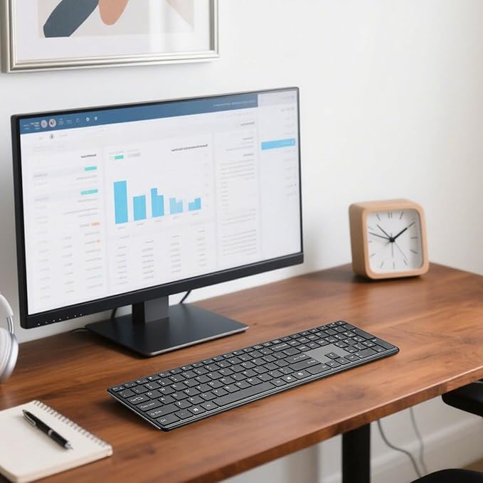 - ⌨️Full-Size Bluetooth Keyboard: The ultra-thin full-size keyboard has an independent number zone and multimedia functions. quiet typing on a familiar wireless keyboard layout , making your work more efficient