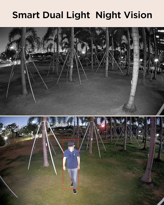 - Smart Dual-Light Full-Color Night Vision: Three night vision modes: Smart Color, Full Color, and IR. Default Smart Color mode activates warm supplemental lighting upon detecting humans/vehicles at night, switching footage from B/W to color. Automatically reverts to IR when activity ceases