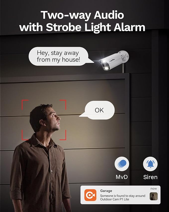 - ✅【Audio & Strobe Light Alarm/ Two-way Audio】- When detected a humanoid(vehicle/person motion), you can tap into the two-way audio to have a conversation, meanwhile the PoE bullet camera will automatically trigger an audio and white light strobe light to scare off the intruder immediately. This house security system is the best choice for you to install it outside such as garaga, yard, doorway, store, apartment ect.