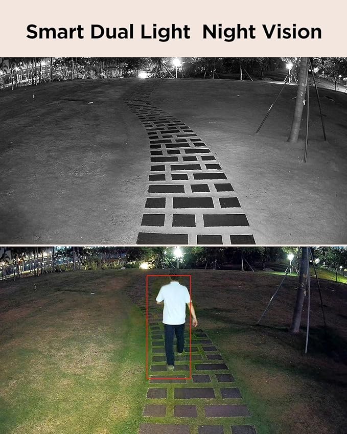 - Smart Dual-Light Full-Color Night Vision: Three night vision modes: Smart Color, Full Color, and IR. Default Smart Color mode activates warm supplemental lighting upon detecting humans/vehicles at night, switching footage from B/W to color. Automatically reverts to IR when activity ceases