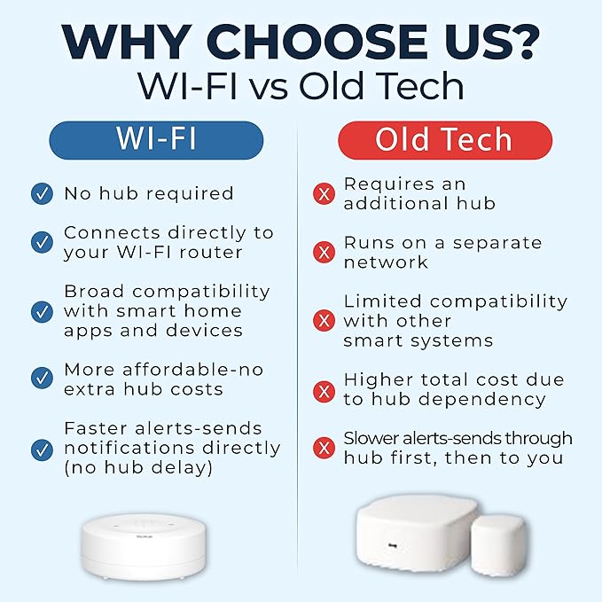 - πΆ EASY WIFI SETUP β NO HUB REQUIRED Connects directly to 2.4GHz WiFi for a simple and hassle-free setup. No additional hub or complex wiring required. Works seamlessly with Smart Life & Tuya app, allowing you to monitor leaks from anywhere via your smartphone.Wi-Fi network and use the intuitive app for 24/7 monitoring.