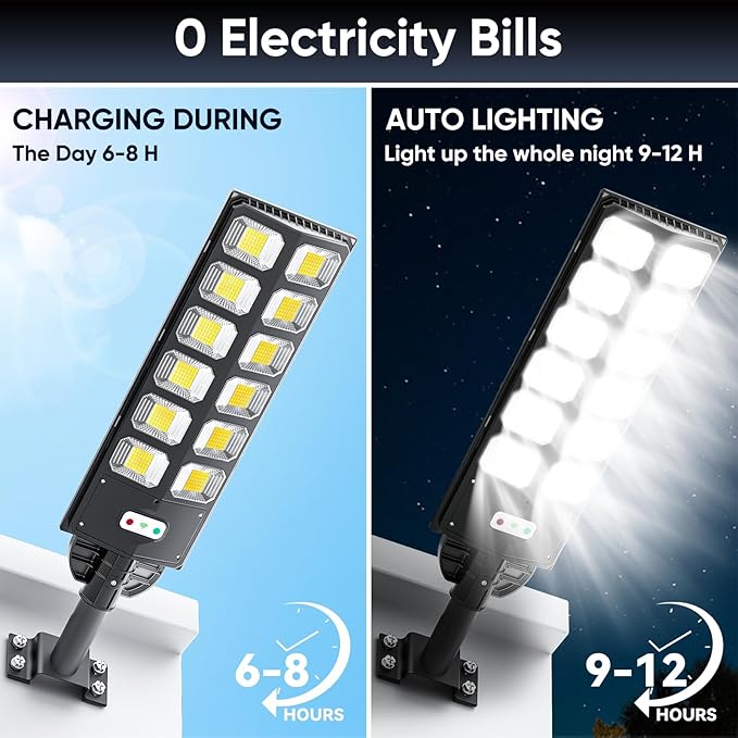 - Stadium-Bright Security: Lights up your whole driveway! 504 high intensity LEDs blast 12500 Lumens brighter than most wired lights. Charges in 6-10 hrs, runs 6-12 hrs on motion or 2 hrs steady glow. Feel safer instantly.