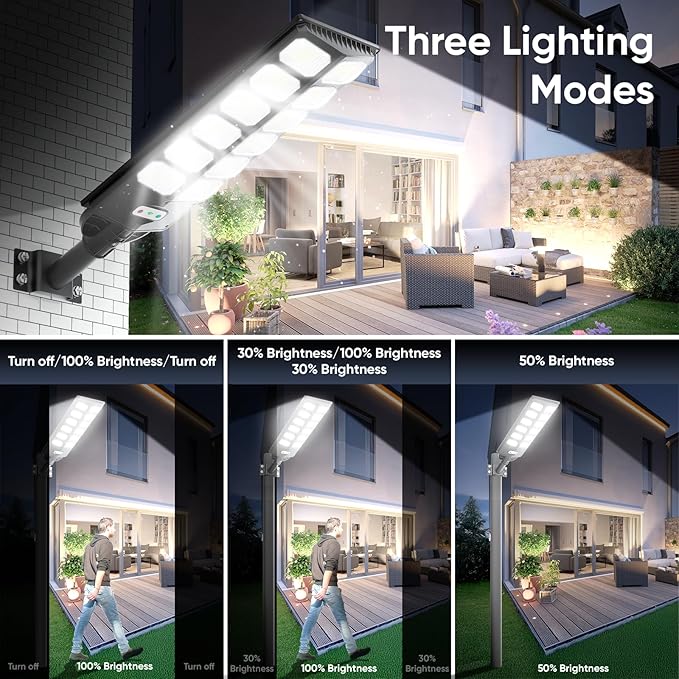 - Smart 3-Mode Motion Sensor: Mode 1 (Security): Full 100% brightness instantly upon detection, auto-off after 25 s. Mode 2 (Efficiency): Brightens from 30% to 100% when motion sensed. Mode 3 (Ambient): Constant gentle 50% glow for subtle pathway lighting.