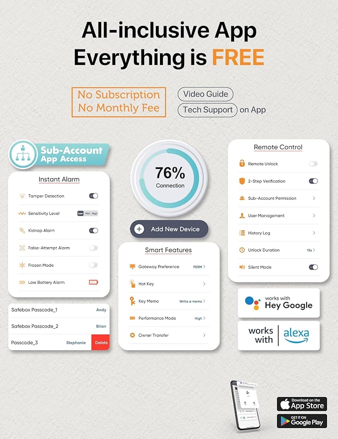 - 【One Safe for the Entire Family & Office】 Register up to 99 passcodes and unlimited number of App sub-account users. Smart speakers (Amazon Alexa, Google Home) are also compatible to join the smart security system. User management and history events are available in the FORFEND App.