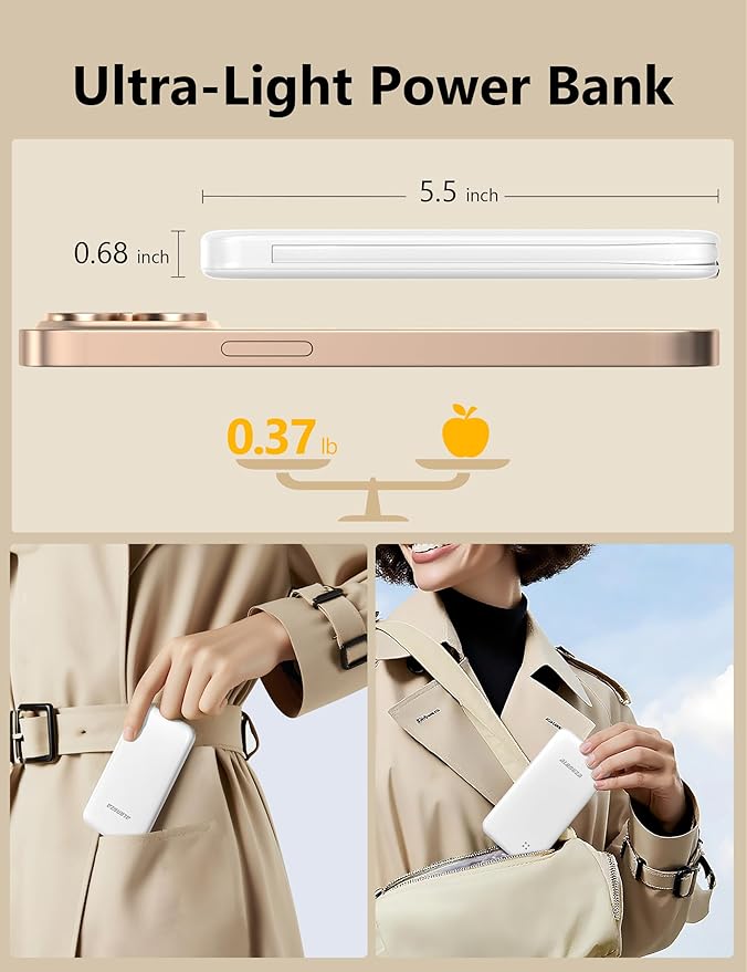 - 0.37 lbs Ultra-Light Portable Charger for iPhone: This lightweight power bank weights only 0.37lb, with dimension 5.5" x 2.79" x 0.68", making it shorter than an iPhone and light enough to use comfortably while charging. It slips effortlessly into your pocket or small bag, making it the ultimate travel essential.
