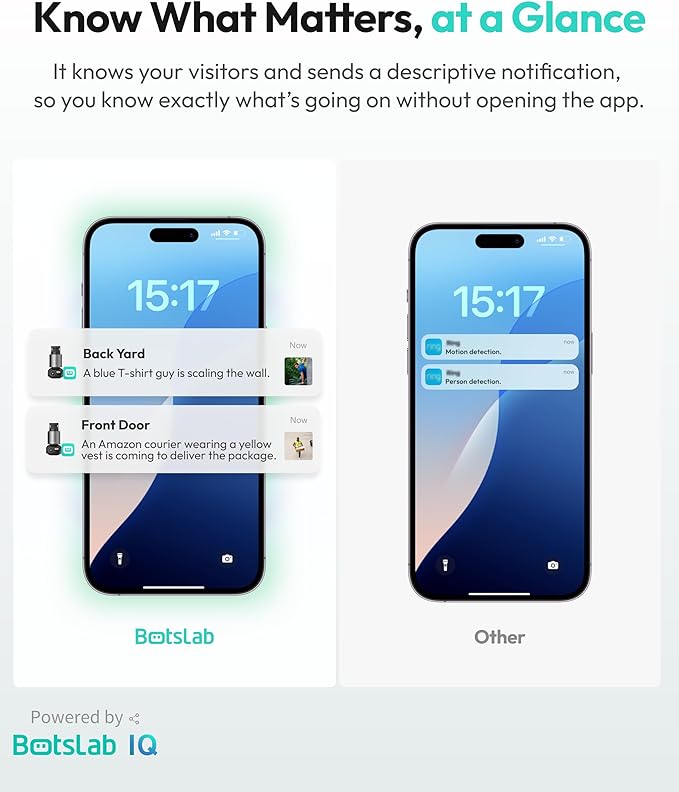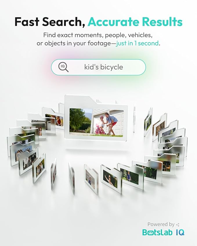 - Solar Security Camera with BOTSLAB IQ: 1. The camera uses artificial intelligence to identify visitors and sends detailed, descriptive notifications so you know exactly what's going on without having to open the app. 2. The outdoor security camera analyzes the scene and sends customized warnings to suspicious people based on the severity level. 3. The quick search function helps you find people, vehicles, or objects in historical footage in 1 second.