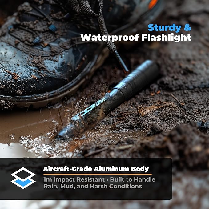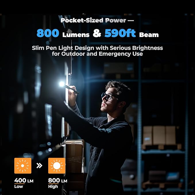- Bright & Long Beam Distance: The pen light flashlight features a high-quality LED chip, delivering up to 800 lumens of brightness in a compact design. Bright flashlight also excels in long-range performance with a beam distance of up to 180m/ 590ft, making it perfect for hiking adventures, camping in the wild or family emergencies.