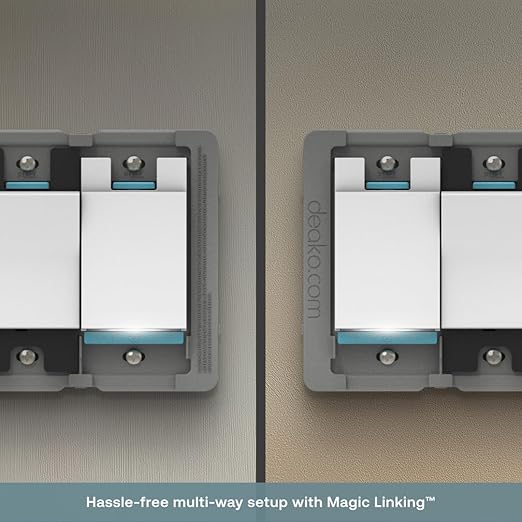 - HASSLE-FREE INSTALLATION: Powered by exclusive Magic Linking technology, Deako’s next-gen switch automatically configures multi-way lighting setups with zero programming or electrical wiring required.