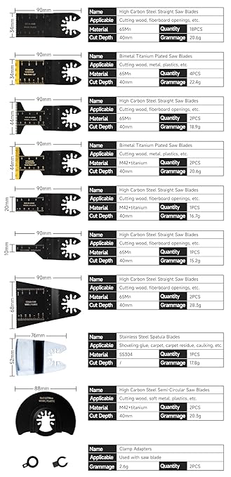- 35 PCS Oscillating Tool Blades Kit Includes 18PCS 1-3/8” Blades Wood and Plastic, 4PCS 1-3/8” Titanium-Coated Bimetal Blades, 2PCS 1-3/4” Titanium-Coated Bimetal Blades, 2PCS 1-3/4 "Blades for Wood and Plastic, 1PCS 3/4 "HCS blade, 1PCS 3/8" HCS blade, 2PCS 2-5/8 "HCS blade, 1PCS 2" stainless steel scraper, 2PCS 3-1/2 "semi-circular, 2PCS adapter. 8 Different Oscillating Saw Blades, Providing Versatile Cutting Solutions.