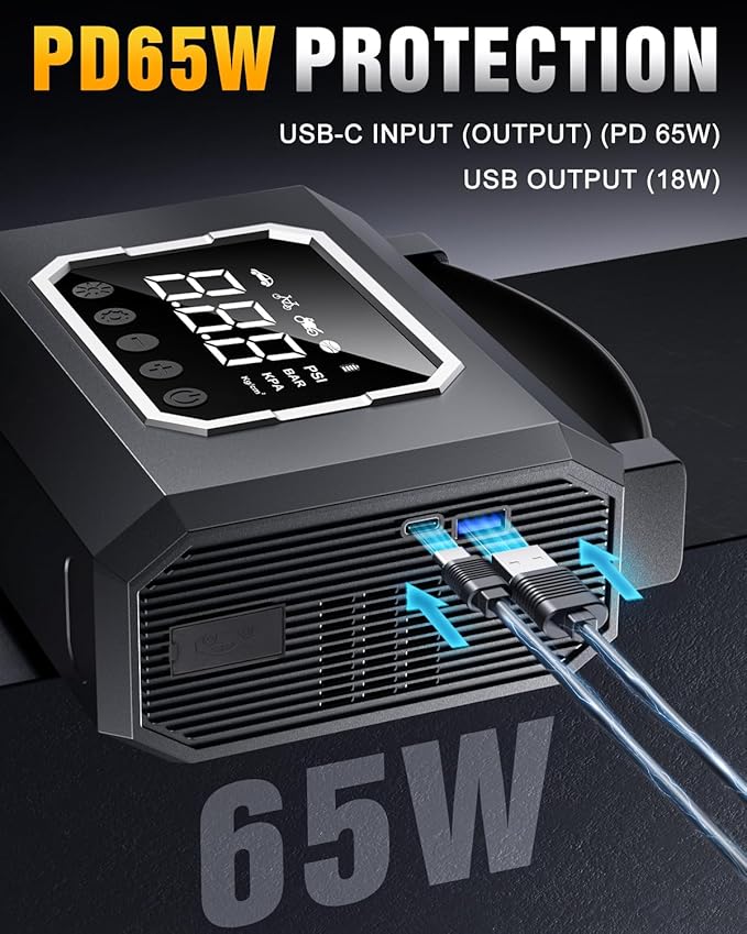- Dual Fast-Charging Power Bank (65W USB-C & 18W USB-A): Equipped with a 26800mAh high-capacity battery, this portable tire inflator for car doubles as a portable power bank. The 65W USB-C and 18W USB-A ports deliver rapid charging for phones, laptops, and other devices—up to 75% faster than standard chargers—making it the perfect on-the-go power solution for road trips and emergencies.