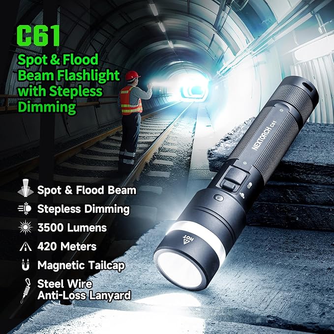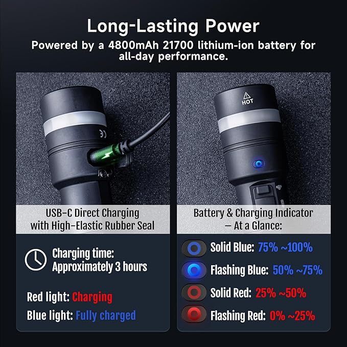 - 【Type-C Charging, Waterproof and Portable】 C61 flashlight charges quickly via Type-C. It features a withstand harsh industrial design that's protected from dust and water (IP67) while capable of 1 m drop-resistant. Reliable in all weather. It also includes a wire lanyard for easy carrying, perfect for both indoor and outdoor use