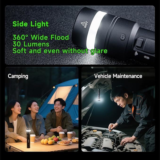 - 【Innovative Bidirectional Lighting】 C61 handheld rechargeable flashlight offers high-performance front-light LED and reverse step-less dimming light, which can be easily switched with a flick of the toggle switch