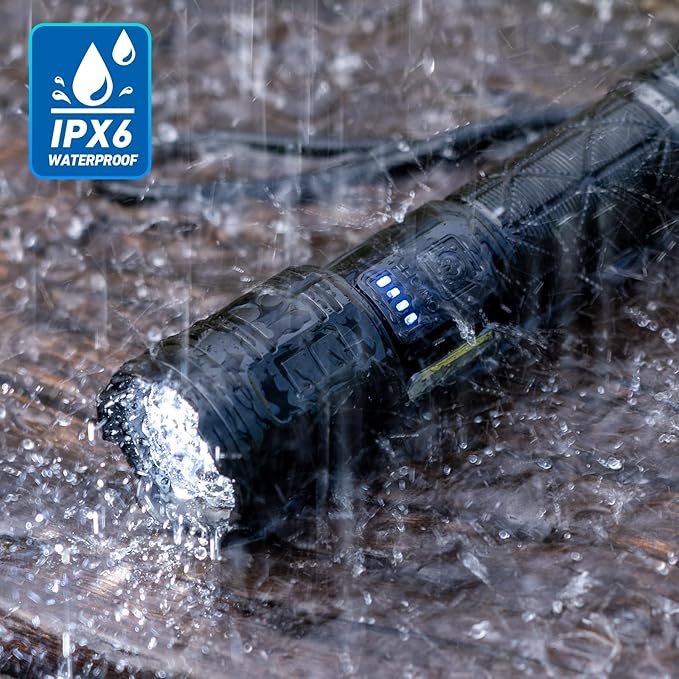 - ๐ฆ[IPX6 WATERPROOF & HIGH-QUALITY MATERIALS] - The high lumen flashlight is highly waterproof and can be used properly in wet environments. And it is made of military-grade aluminum alloy material, which is drop and wear resistant.