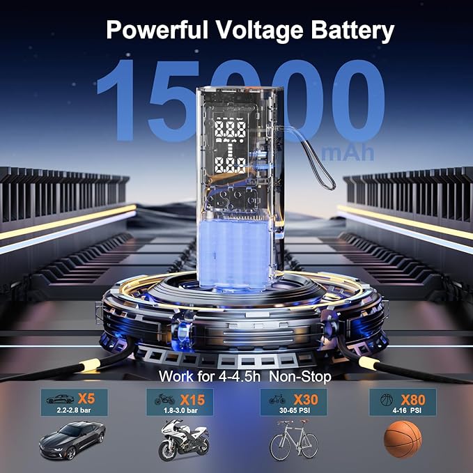 Tire Inflator Portable Air Compressor - 150PSI Air Compressor with Tire Pressure Gauge, 15000mAh & 3X Faster Portable Air Pump for Cars, Bikes & Motorcycle Tires, Balls, Car Accessories