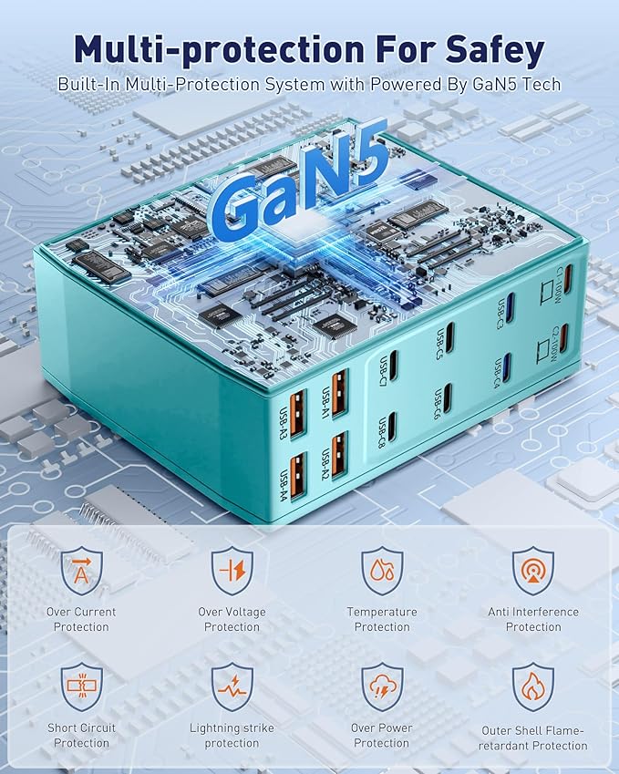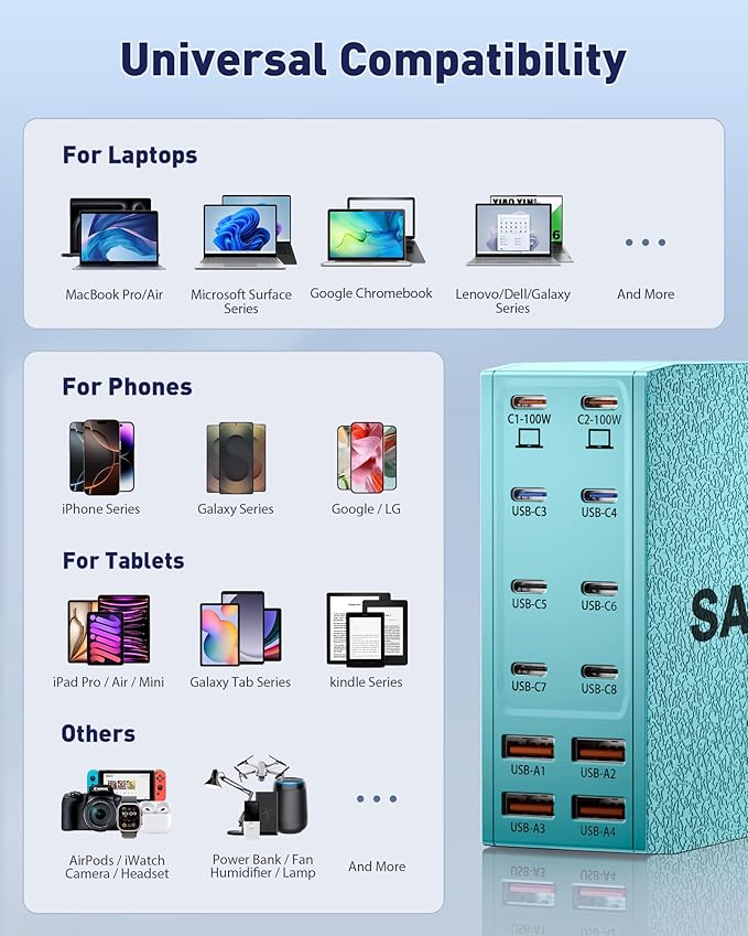 - 【Universal Compatibility】Our USB C charging station is equipped with 2*100W and 2*65W fast charging ports, which can charge 3 or more laptops at the same time. Compatible with smartphones, tablets and laptops, suitable for MacBook Pro/Air, Dell XPS, iPad Pro, Phone 16/16 Pro Max, Phone 15 Pro Max, Phone 14/13 Pro/12 Pro Max, iWatch, AirPods, Surface Pro, Galaxy S24 Ultra, Switch, Steam Deck, Google Pixel and many other devices.