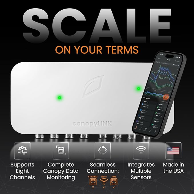 canopyLINK Sensor Hub – Connects Up to 8 Substrate or Climate Sensors – Compatible with CO2, Moisture, Light, and More – Smart Monitor for VWC, Conductivity, Temperature, RH, VPD