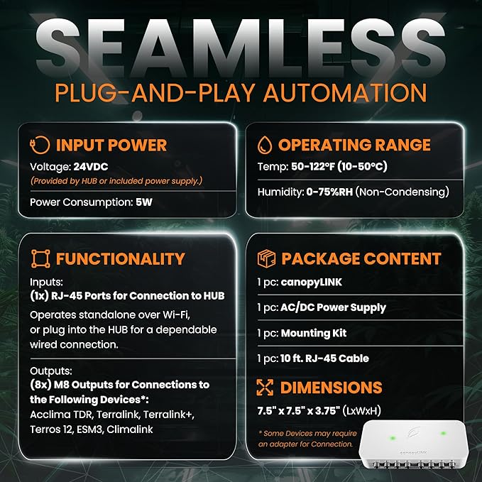 - CONSOLIDATE & SCALE: canopyLINK registers as a single device in Growlink OS, freeing up Hub ports and simplifying complex installs.