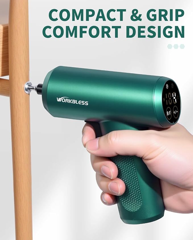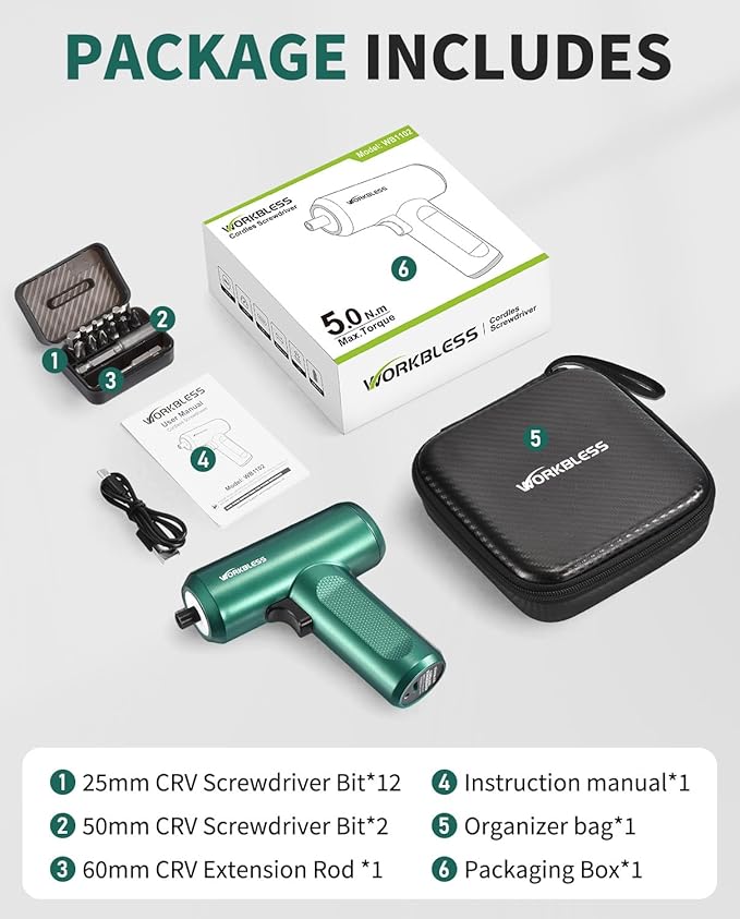 - 【5Nm Torque & 3.7V 2000mAh Battery】The WORKBLESS power screwdriver delivers 5Nm max torque and 250 RPM speed for efficient drilling and fastening in wood, plastic, and light metal. The 2000mAh battery ensures long running time (300+ screws per charge) and supports Type-C fast charging (2-3 hours).