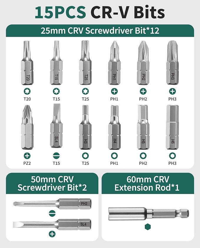 - 【Strong Magnet & 15 PCS Accessory Kit】Includes 15 durable CR-V steel bits (H3-H6, PH1-PH3, PZ2, SL4, T15-T25) + extension rod, stored in a portable EVA fabric case. Built-in powerful magnets ensure drill bit stability during use.
