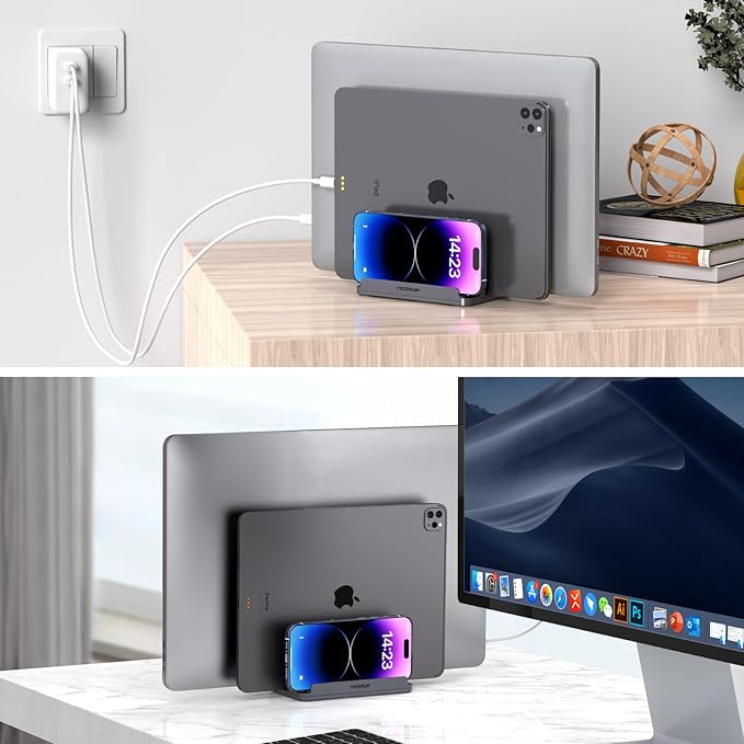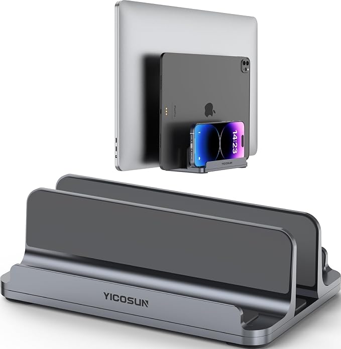 - Triple-Slot Design: Vertical stand features 3 slots, allowing you to store both a laptop and a tablet and a phone simultaneously, making it a space-saving solution for your desk.