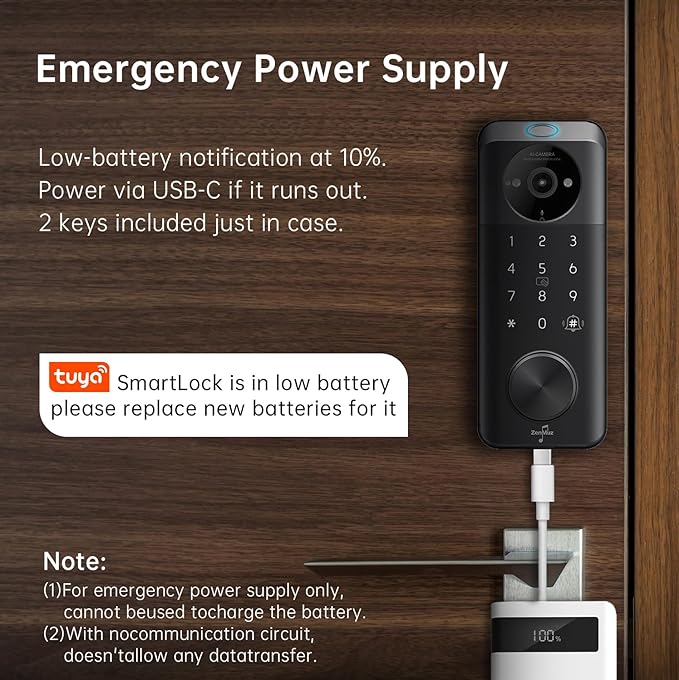 - Rechargeable Smart Lock for Front Door with Camera:Never worry about dead batteries! This camera door lock for homes features 5,000mAh rechargeable batteries, lasting 3-4 months per charge. Withstand extreme weather (-22°F to 158°F) and enjoy remote WiFi control—lock/unlock doors or check visitors from anywhere via the app.Emergency power supply low battery notification at 10%. If the battery is depleted, power is supplied through USB-C. Includes two keys, just in case