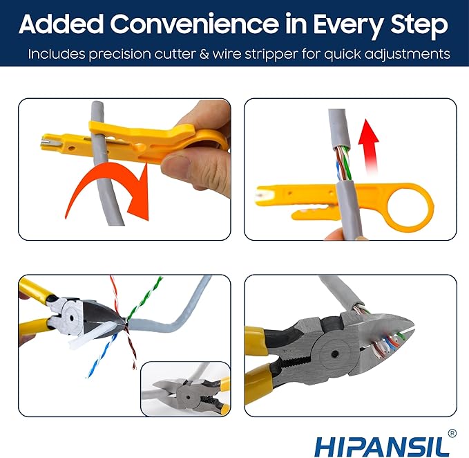 - QUICK, ACCURATE INSTALLATIONS – Say goodbye to guesswork thanks to the built-in wiring guide that ensures perfect alignment and zero rework—every single time. Our ethernet cable crimping tool and pass through modular crimper offer precise terminations even in tight spaces. Equipped with a cat6 termination tool and pass through RJ45 crimp tool, it aligns wires clearly and crimps them securely. Compatible with cat6 tool kit and ethernet termination tool, it's ideal for accurate ponchador rj45 setups. Works seamlessly with network tool kit, networking tools, ethernet kit, rj45 tool, ethernet connector kit, ethernet cable tools, lan tools,crimper rj45 and crimping tool ethernet performance.