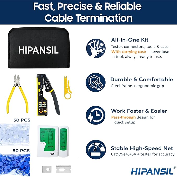 - EFFORTLESS CRIMPING PERFORMANCE : Power through terminations like a pro with our pass-through RJ45 crimp tool, delivering flawless, rock-solid connections in seconds. Whether you're upgrading your home LAN or handling office cabling, this ethernet crimper tool kit gives you full control. The kit includes every essential from a cat 5 crimping tool kit to a cat 6 crimping tool kit,rj11 crimping tool,cat 6 crimper, making it ideal for both beginner users and pro installers. Designed as a complete ethernet crimping tool kit, it features a precision crimping tool RJ45, small RJ45 crimper, and passthrough RJ45 crimper that ensures every RJ45 crimp is perfect with any ethernet cable crimper kit.