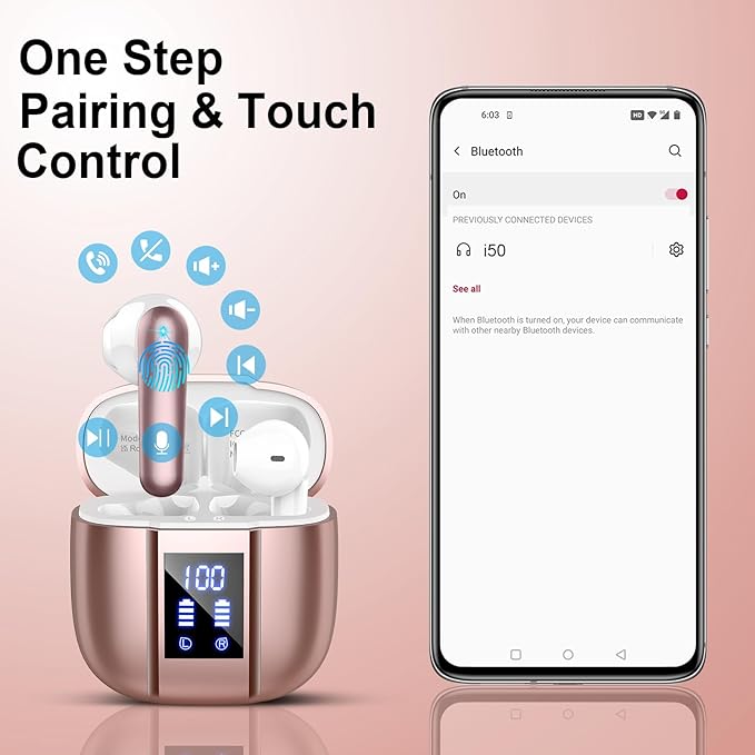 Wireless Earbuds, Bluetooth 5.4 Headphones, 48H, Stereo Ear Buds, LED Display Earphones with Mic, IP7 Waterproof In EarBud, Comfort Fit, Bluetooth Earbuds for Phone Android iOS, Sport, Walk, Rose Gold