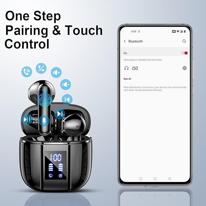 - IPX7 Waterproof & Intelligent Touch Control:With intuitive touch-sensitive controls, these wireless earbuds for Android let you manage playback, adjust volume, handle calls, and activate voice assistants directly from the earbuds—no phone needed. Built with IPX7-rated protection and advanced nano-coating technology, they effectively resist sweat and rain. Ideal for outdoor sports and demanding environments, these waterproof earbuds deliver reliable performance and clear sound anywhere.