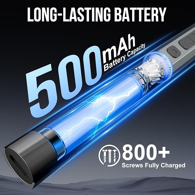 - Long-Lasting Battery, Fast Charging: The small electric screwdriver features a 500mAh lithium-ion battery that has passed 28 safety tests, ensuring long-lasting, reliable performance. With a fast 60-minute full charge, it can unscrew over 800 screws—perfect for electronics, computer, laptops, and more. The universal Type-C charging port offers added convenience with easy compatibility