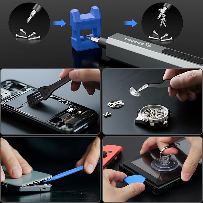 - 144-Piece Electric Screwdriver Kit: The small screwdriver set includes everything you need for electronics repair: 1 electric screwdriver for effortless work, 1 precision screwdriver for added torque, 120 precision bits for a wide range of devices, and 22 essential repair tools for disassembly, cleaning, and maintenance. A perfect screw driver set kit for IT pros, PC builders, and DIY enthusiasts