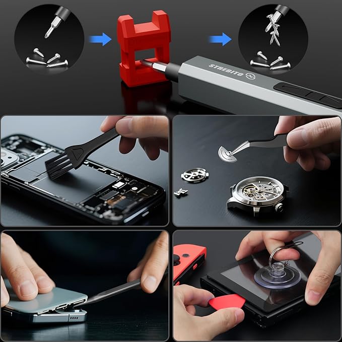 - 144-Piece Electric Screwdriver Kit: The small screwdriver set includes everything you need for electronics repair: 1 electric screwdriver for effortless work, 1 precision screwdriver for added torque, 120 precision bits for a wide range of devices, and 22 essential repair tools for disassembly, cleaning, and maintenance. A perfect screw driver set kit for IT pros, PC builders, and DIY enthusiasts