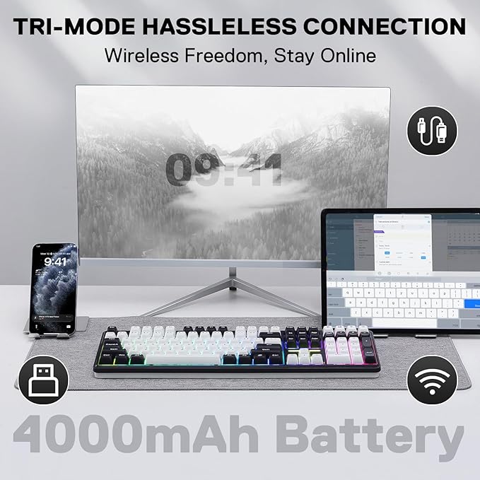 - 3-Mode Connection - Geared with Redragon advanced tri-mode connection technology, USB-C wired, BT 3.0/5.0 & 2.4Ghz wireless modes which make the user experience upgraded to another level in all fields