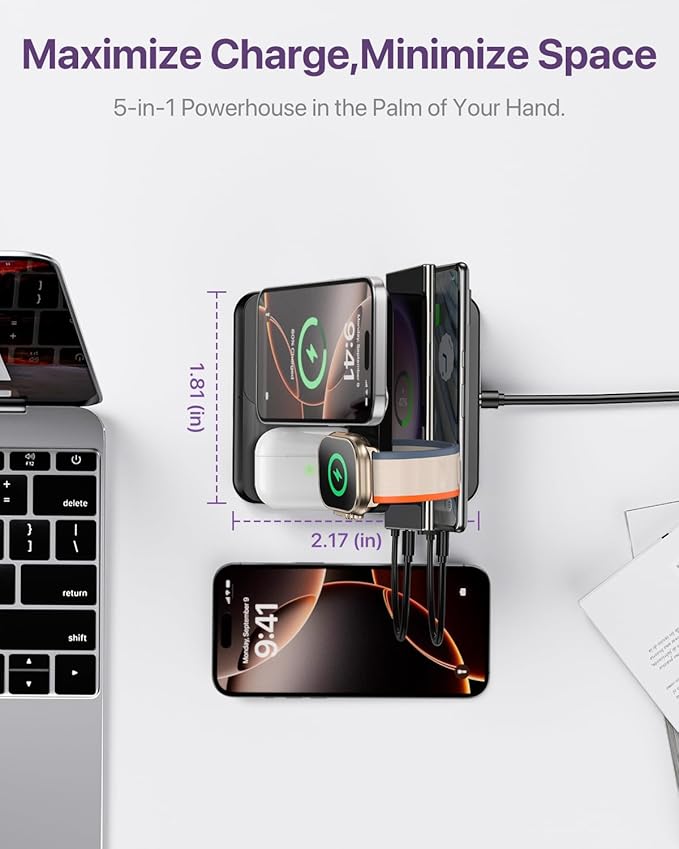 - [Compact Space Saver]Maximize your workspace with this 5-in-1 charging station. Designed to organize and charge your Apple devices, it features a built-in partition to keep your desk or nightstand tidy. The extra USB and Type-C ports allow you to charge additional wired devices alongside wireless charging. A perfect solution for home, office, or travel, so you can wake up to fully charged devices, all neatly arranged in one compact station.