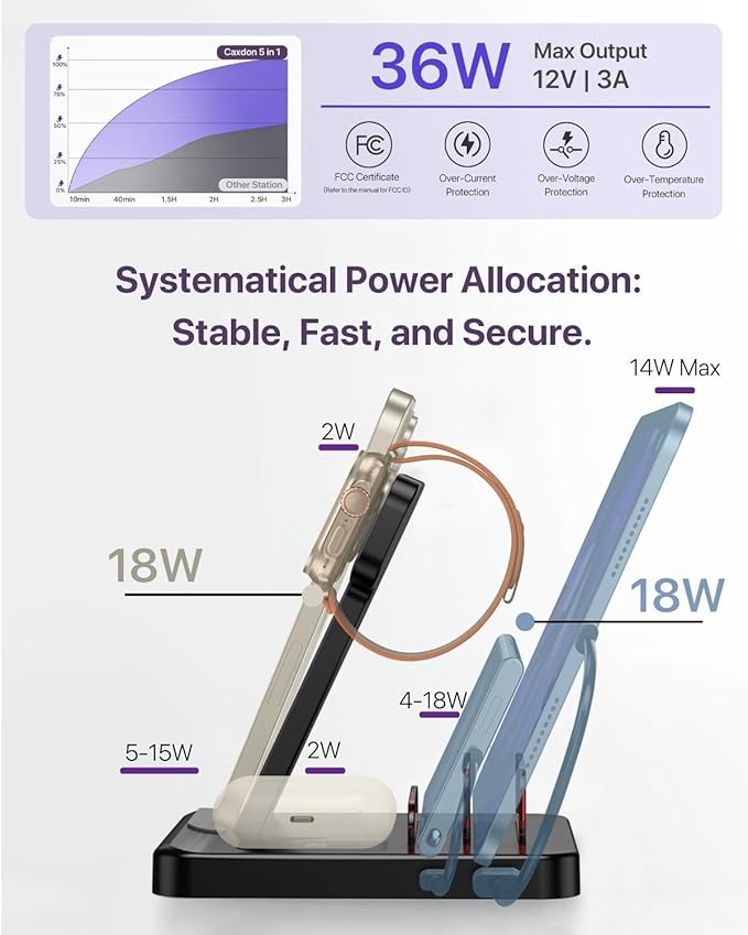 - [Safety and Efficient Cooling]Our FCC-certified charging station for Apple devices features over-current, over-voltage, over-temperature, and foreign object detection for maximum safety. A smart circuit system prevents overcharging, ensuring stable power delivery. Multiple ventilation holes and a heat-dissipating design keep the temperature optimal, preventing overheating and extending your devices' lifespan. Non-slip pads at the base enhance stability and safety for peace of mind.