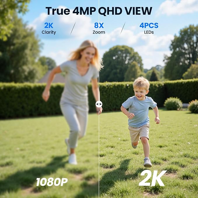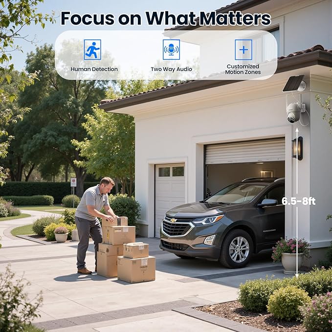 - Solar-Powered Security Camera, Work Nonstop: Each weatherproof ecurity camera come with a 4W solar panel. Just 2 hours of direct sunlight daily powers it continuously. Its built-in 8000mAh battery acts as a backup to ensure uninterrupted performance even in low-light conditions. Install it anywhere sunlight reaches: walls, fences, railings, or door frames—using the included mount. No complicated wiring or technicians are required, saving you time & money