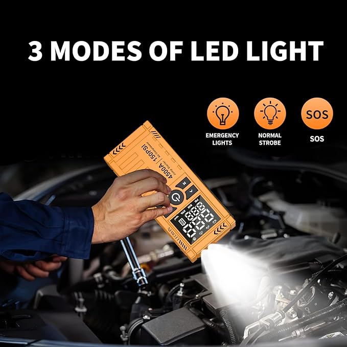 - Multifunctional Portable Jump Starter: Say goodbye to old, bulky jump-start battery packs! Battery Jump Starter is more lightweight and portable with 6 practical functions to meet all your needs, including car emergency jumpstarting, air compressor, 3 light modes (flashlight, SOS warning, strobe), and a power bank (USB ports for charging mobile devices).