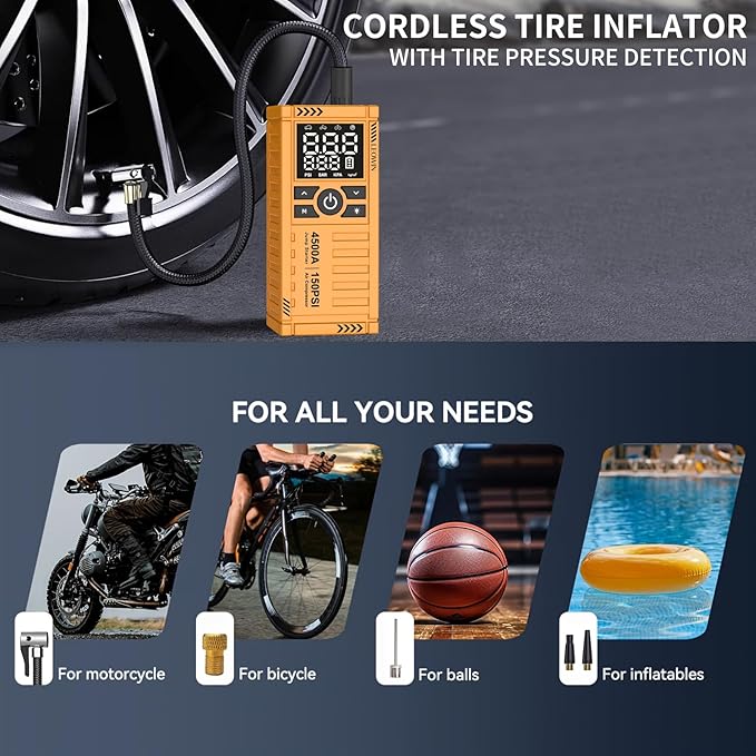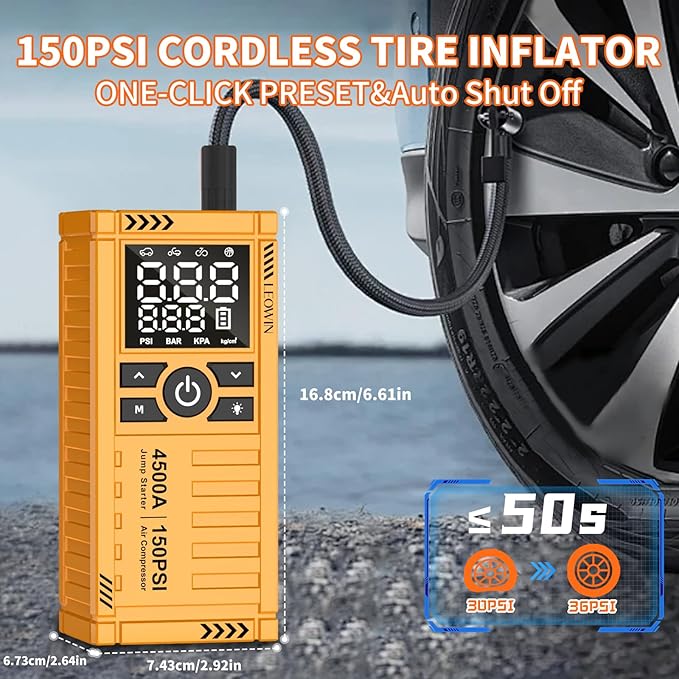 - Portable Air Compressor & Tire Inflator: This 150PSI air compressor has 5 preset modes (4 units: PSI, BAR, KPA, KG/cm²) to inflate cars, motorcycles, bikes, and balls. It automatically stops at your preset value—no need for constant adjustments or monitoring. The air pump’s high-quality cylinder delivers 35L/Min fast inflation, filling a tire from 29PSI to 36PSI in just one minute.
