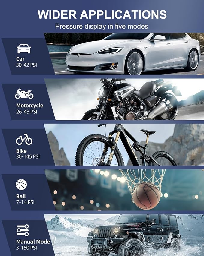 - [More selection modes] - 4 preset modes of portable air compressor make it easier to inflate cars, motos, bikes and balls. And the 0-150PSI Custom mode meets more inflation needs. What's more, 4 pressure units can be switched at will, a digital pressure gauge allows real-time pressure and preset values to be clearly seen everywhere, and the auto-off function when the preset value is reached. Easier operation!