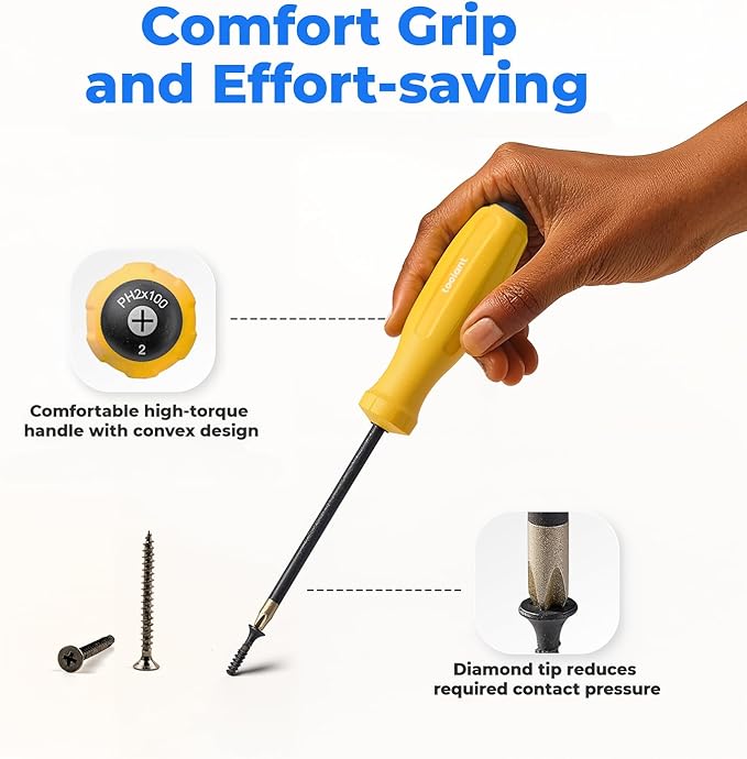 - Labor-Saving Design: The diamond grit coating significantly reduces the required contact pressure, cutting effort by at least 4 times compared to standard screwdrivers. Additionally, it enhances torque by 1.5X, allowing for smoother and more relaxed work