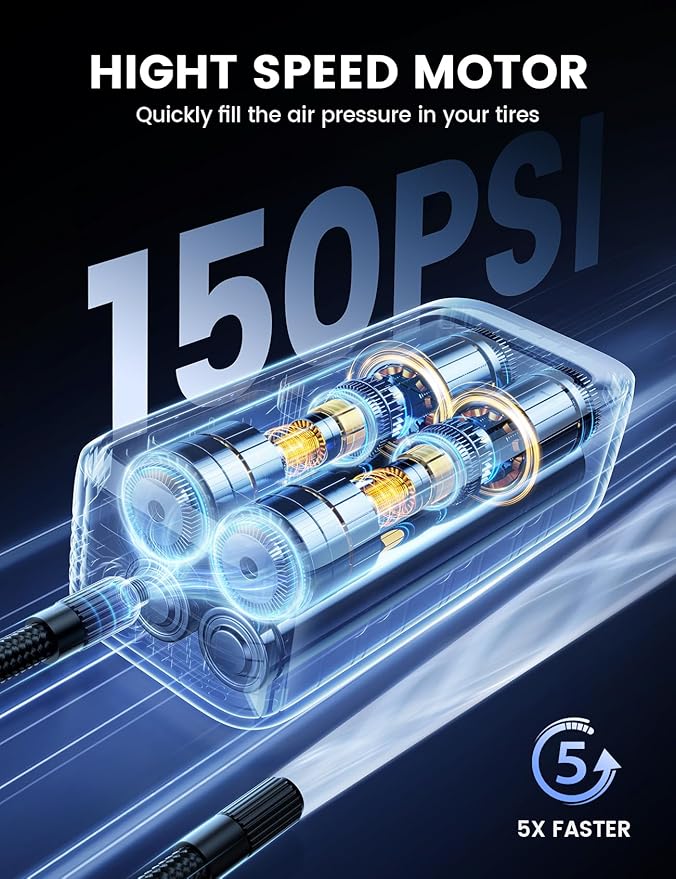 - 【Powerful 5X Faster】 Up to 35L/Min inflation airflow rate, the maximum pressure of this inflator can reach 150 PSI. Can be 195/65 R15 tires in 1 minute from 28 to 36PSI. This is a must-have accessory for car, motorcycles and bike.
