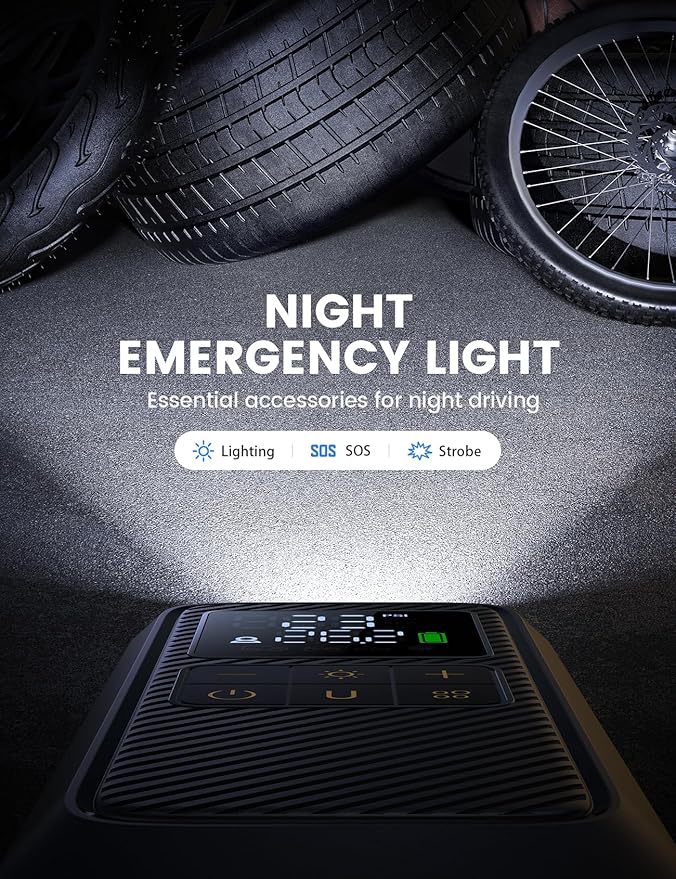 - 【LED Digital Display 】The pump features a high-definition LED display that clearly shows tire pressure value, battery level, etc. This LED display make it easier to use this air pump at night. It also comes with an emergency light function with 3 light modes (Flashlight, SOS and Strobe light) to keep you safer in the dark.