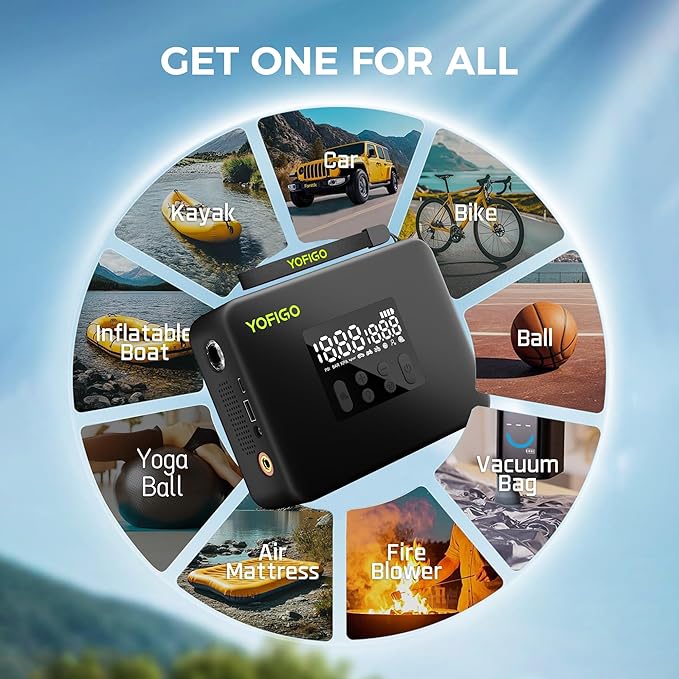 - ๐ง Portable Tire Inflator & Air Pump 2 in 1-Whether you're on a road trip or just need quick inflation at home, this 2-in-1 portable tire inflator doubles as a air inflator for car tires, air mattresses, pool floats, balloons, and sports equipment. It's the ultimate handheld tire pump that saves space and handles it all.
