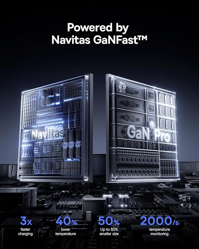 - Efficient Cooling & Safe Charging: Compared to silicone chips, GaN generates about 40% less heat. And graphene inside this fast charger can help dissipate heat. These cooling designs stop the charging from overheating during operation. It also features overcurrent, overvoltage, and short-circuit protections for your peace of mind.