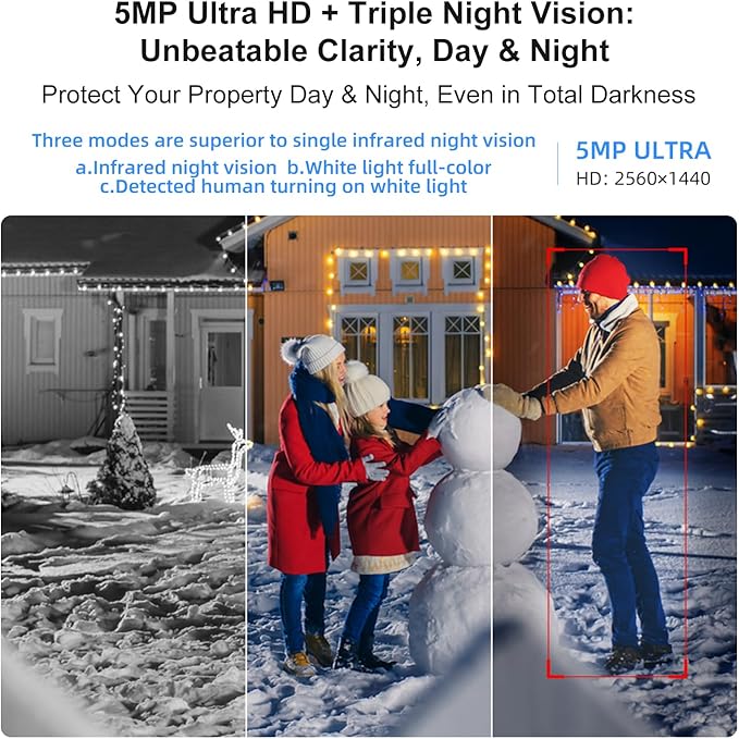 - 5MP HD & Triple Night Vision Modes: Capture crystal-clear 5MP footage day and night-sharp enough to see faces, license plates, and small objects from a distance. Switch between infrared black-and-white, full-color, or smart mode to get the perfect view, even in total darkness. Every detail stays sharp, no matter the lighting.