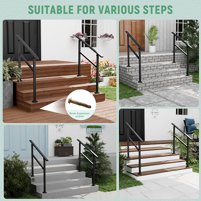 - Wide Application: Suitable for concrete, wood, tile, marble, and other solid surfaces, this outdoor step handrail is ideal for patios, balconies, porches, gardens, residential buildings, hotels, garages, and more. It enhances safety and accessibility wherever needed.
