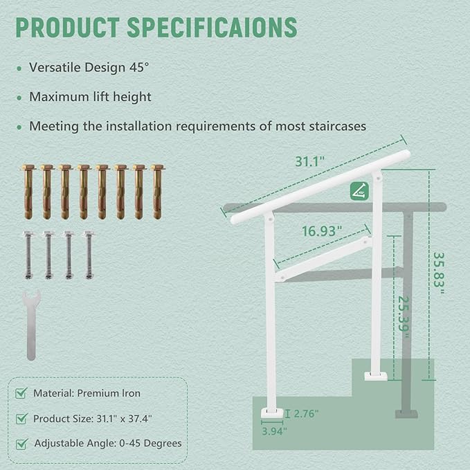 - Adjustable and Versatile: With a rail length of 29.52 inches, support post height of 37.4 inches, and middle rail length of 12.2 inches, our handrail easily adjusts to your desired step height without modification. It accommodates a range of 0-45 degrees, making it perfect for 1-2 vertical steps or flat surfaces.
