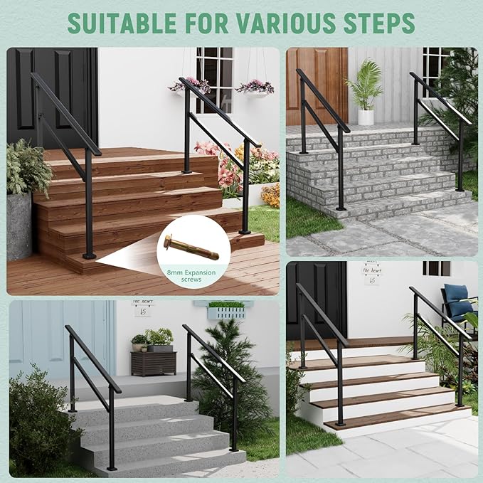 - Wide Application: Suitable for concrete, wood, tile, marble, and other solid surfaces, this outdoor step handrail is ideal for patios, balconies, porches, gardens, residential buildings, hotels, garages, and more. It enhances safety and accessibility wherever needed.