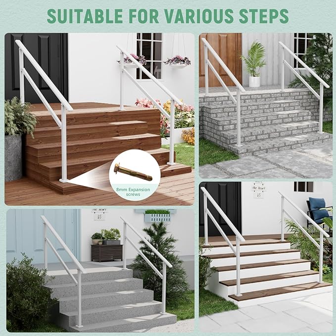 - Wide Application: Suitable for concrete, wood, tile, marble, and other solid surfaces, this outdoor step handrail is ideal for patios, balconies, porches, gardens, residential buildings, hotels, garages, and more. It enhances safety and accessibility wherever needed.
