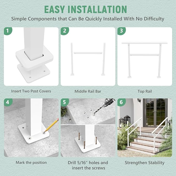 - Wide Application: Suitable for concrete, wood, tile, marble, and other solid surfaces, this outdoor step handrail is ideal for patios, balconies, porches, gardens, residential buildings, hotels, garages, and more. It enhances safety and accessibility wherever needed.